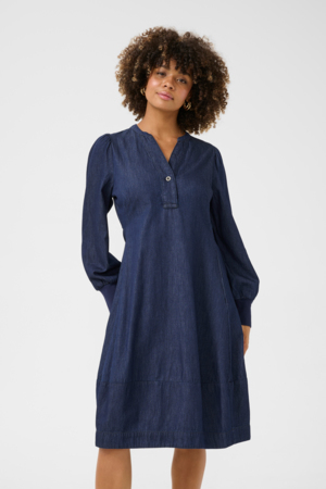 Skøn Culture kjole i den blødeste denim. Modellen er super god, den giver en smuk figuar uanset kropstype. Kjolen har korte ærmer og en flot v- udskæring med stolpelukning. Der er lommer i siden.
