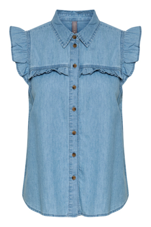Super fin Cuture bluse i et klassisk look. Blusen er ærmeløs og har en høj krave som lukkes bagpå med 2 små knapper. Den har etr loose fit og er perfekt under fx. en blazer da den ikke fylder noget.