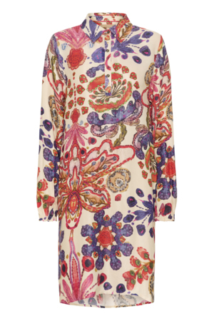 Farverig og feminin Culture kjole i en lækker viskose kvalitet. Kjolen er knælang med en afslappet pasform som gør kjolen behalig at have på og nem at style. Den har lange ærmer med en smal elastikkant, krave og stolpelukning samt lommer i siden.