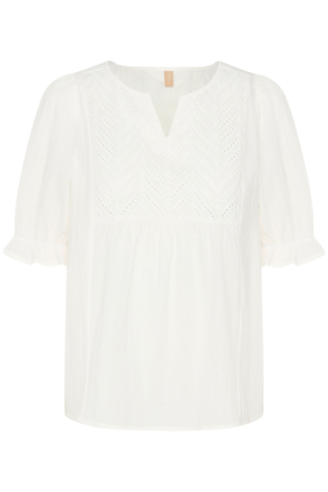 Smuk feminin bluse fra Culture. Blusen har kalvekrøs og små knapper ned foarn. På hver side af knaplukning er der også en fin bort med et hul mønster. Der er 3/4 lange ærmer med en smal elastikkant.