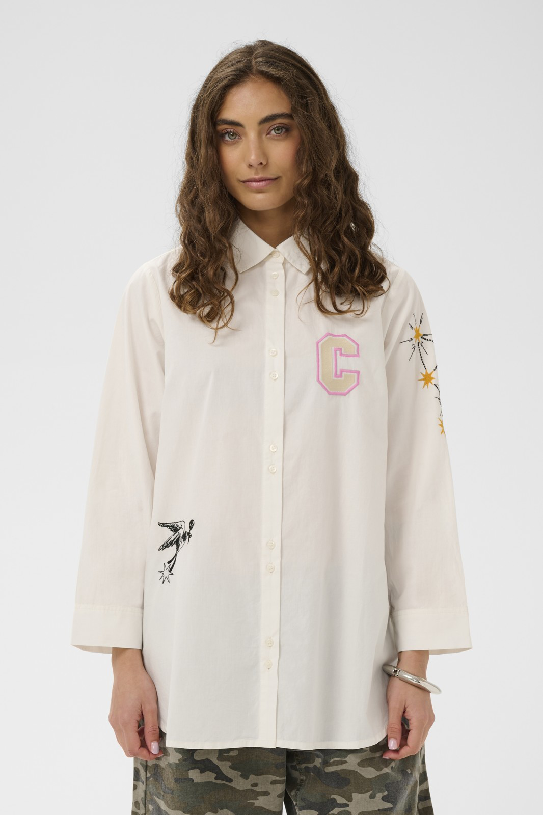 Skøn og trendy Culture skjorte med farverige broderinger. Skjorten har en klassisk krave med flip og lange æmer med en bred manchet. På hver sin side af stolpelukning og ned langs ærmerne er der de smukkeste broderier i et flot farvemix.