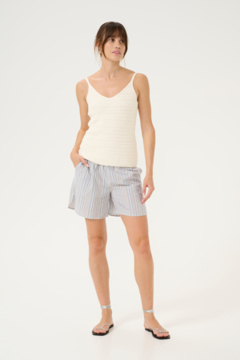 Orla Vest fra Marta er en moderne og stilren vest, der kombinerer komfort og kant. Kvaiteten er blød og let struktrureret. Vesten har rund hals, brede skuldre og et let boxy snit med elastikkant nederst. Den har en flatterende pasform og et afslappet look. Style den alene, over en skjorte eller mesh bluse.