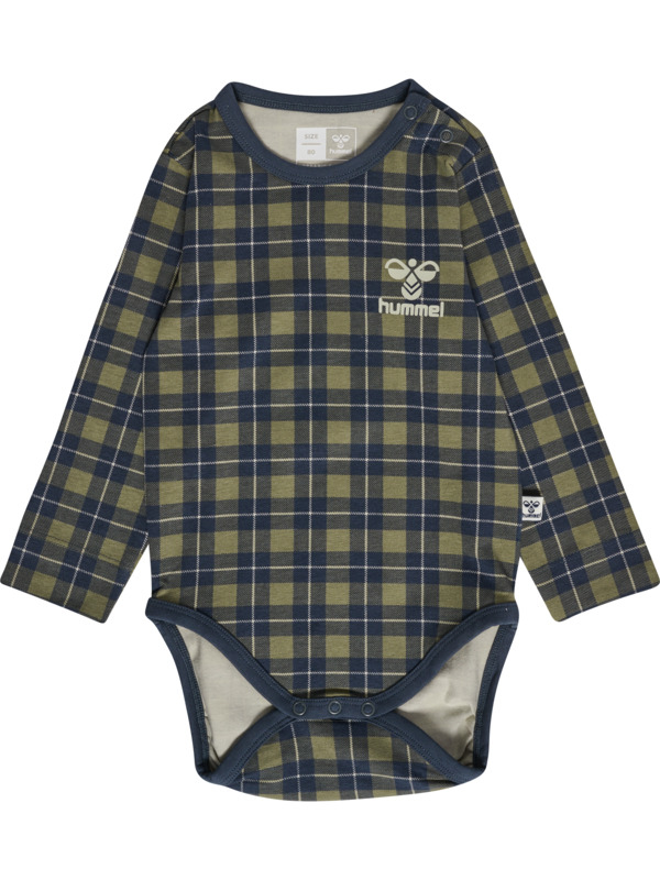 Super sej Hummel Body til dreng i flot tern med farverne oliven og grå. Bodyen er med praktiske trykknapper ved skulder og gylp.