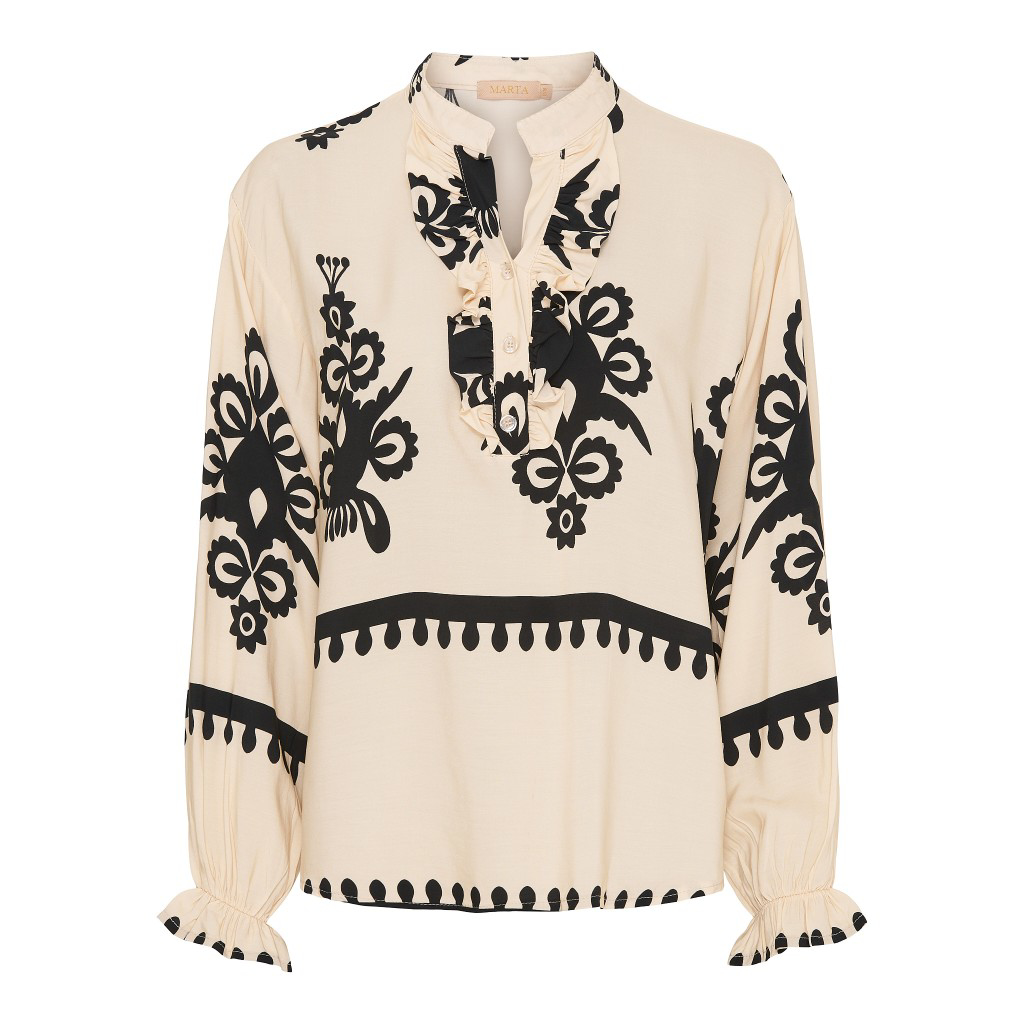 Smuk viskose bluse fra Culture i skønne forårs nunancer. Blusen et kort løst ærme med flæsedetalje, en fin v-udskæring og en løs pasform. Style den til shorts, hørbukser og jeans alt efter lejligheden.