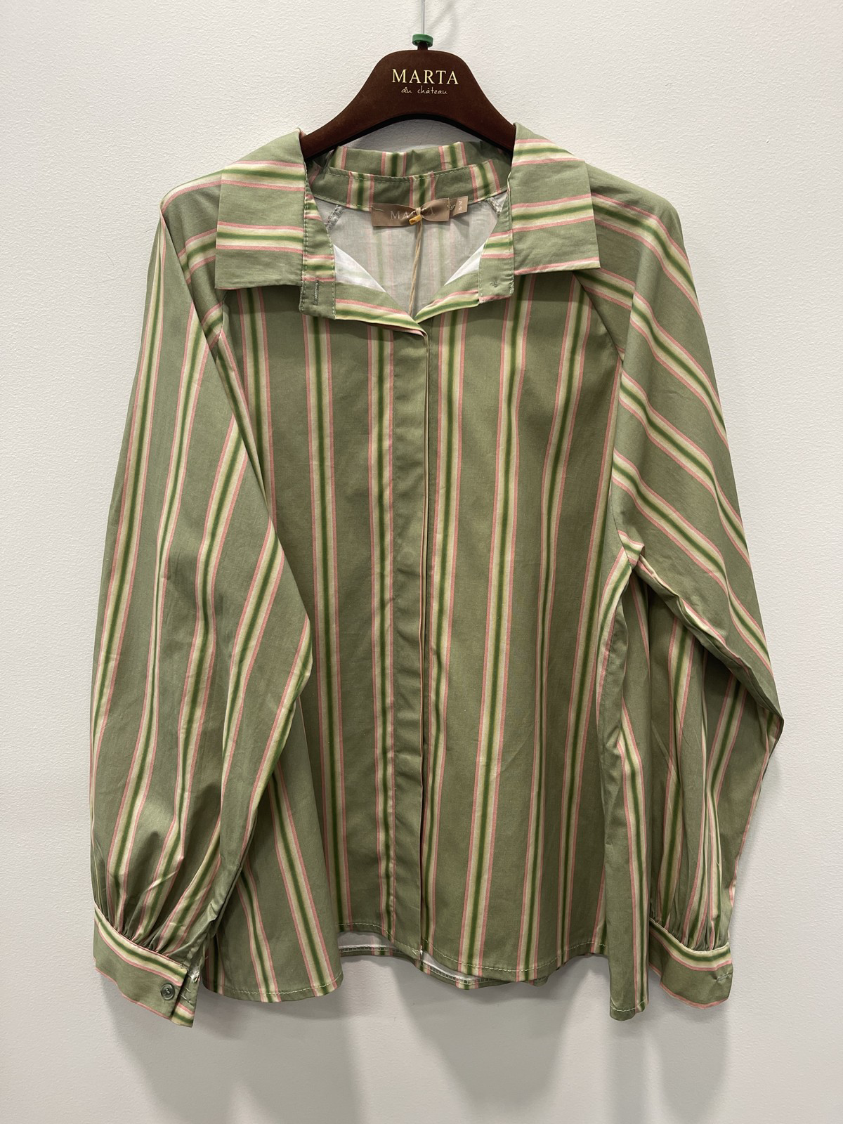 Super flot skjorte fra Culture med klassiske hvide striber og krave. Skjorten har lidt længde med slidser i siden og flot afrundet kant nederst. De påsatte bloster giver skjorten et feminnt touch.