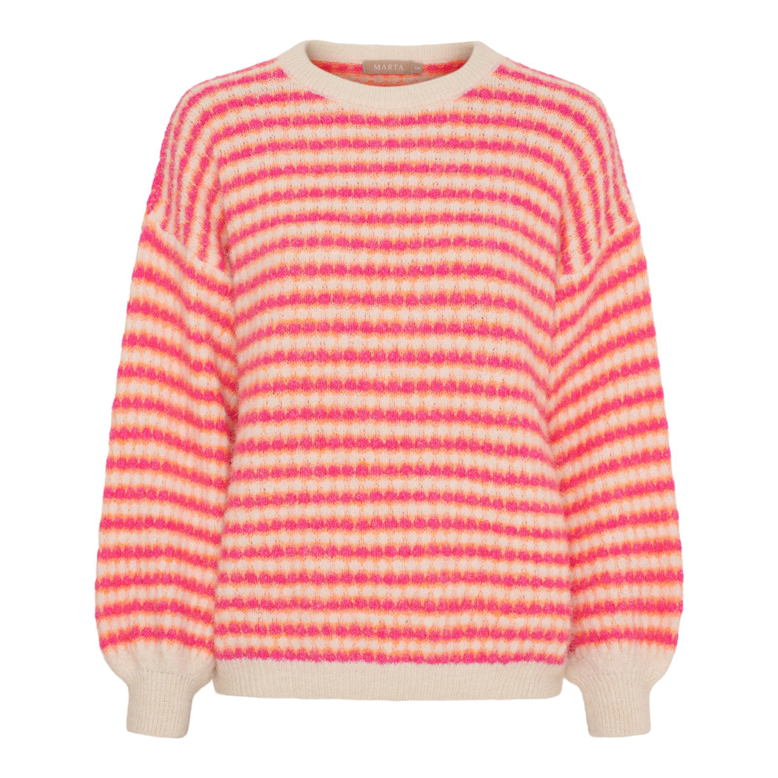 Skøn Marta strik i glade friske farver, der er sat op i et stribet mønster. Strikken har en rund halsudskæring og lange ærmer.