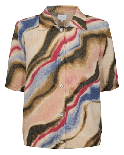 Skønneste pink cardigan fra Nümph med hvide indvævede figurer. Den har korte ærmer, er gennemknappet og har en fin krave. Femnine bølgekanter på krave ærmer og i bunden. En typisk Nümph style.