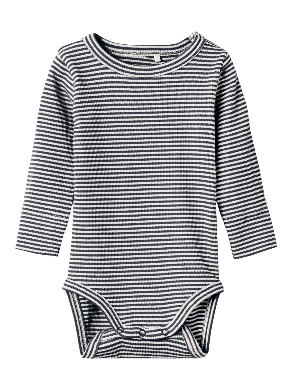 Super fin Hummel body til dreng i blå, og til pige i lyserød. Den er med lange ærmer, O-hals og med logo på front. Den har praktiske trykknapper på højre skulder og mellem benene.