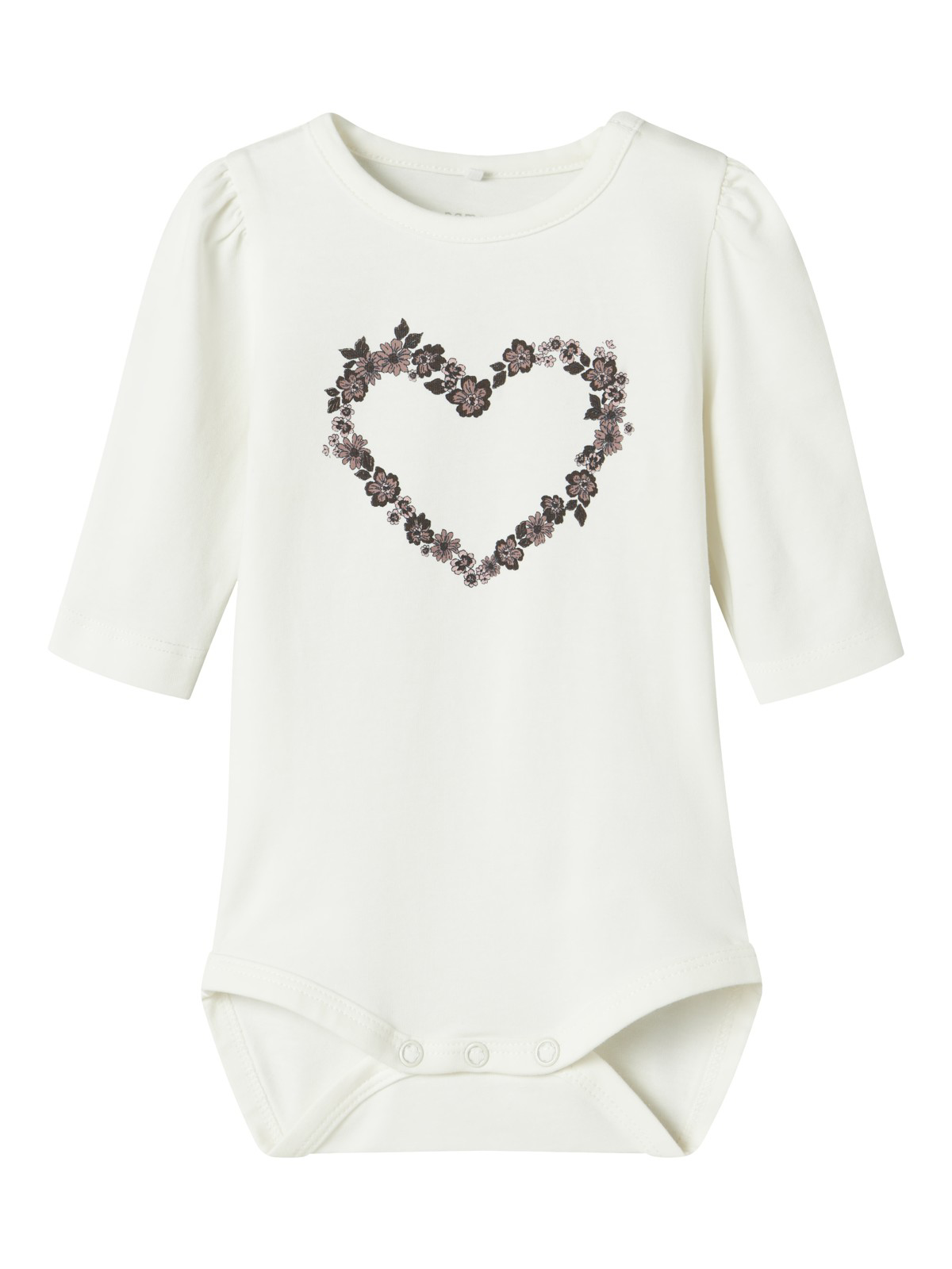 Sød Hummel Body fra Hummel til pige i råhvid med små Hummel logoer i forskellige farver over det hele. Den har praktiske trykknapper ved skulder og gylp.