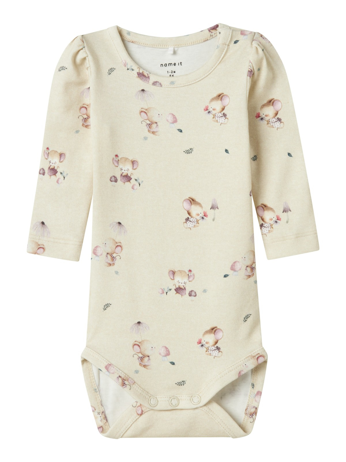 Sød Hummel Body fra Hummel til pige i råhvid med små Hummel logoer i forskellige farver over det hele. Den har praktiske trykknapper ved skulder og gylp.