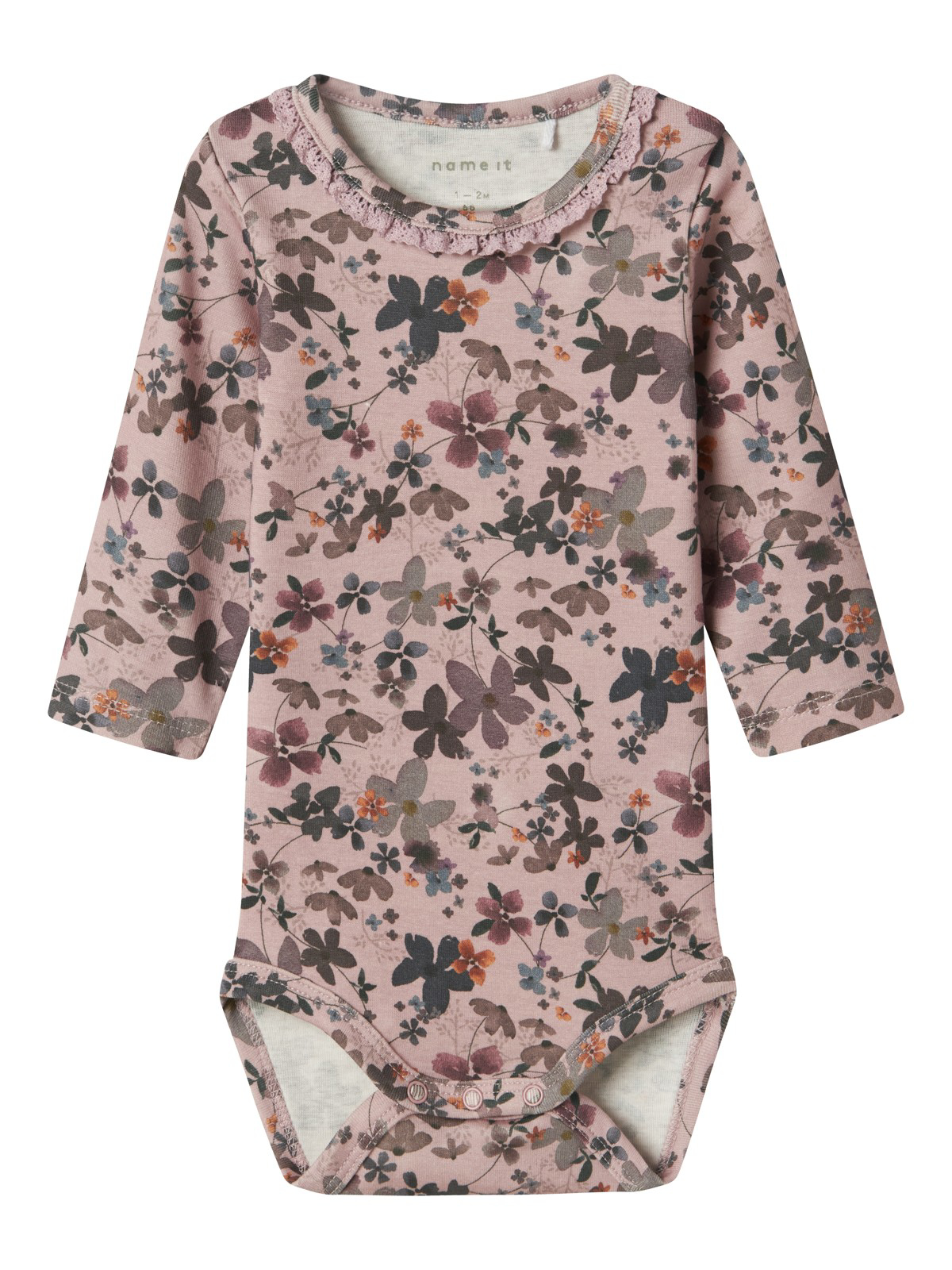 Super sød Hummel body i rosa eller grøn. Foran er der print med logo. Bodyen har lange ærmer med flæser, og den har praktiske trykknapper på venstre skulder og mellem benene.