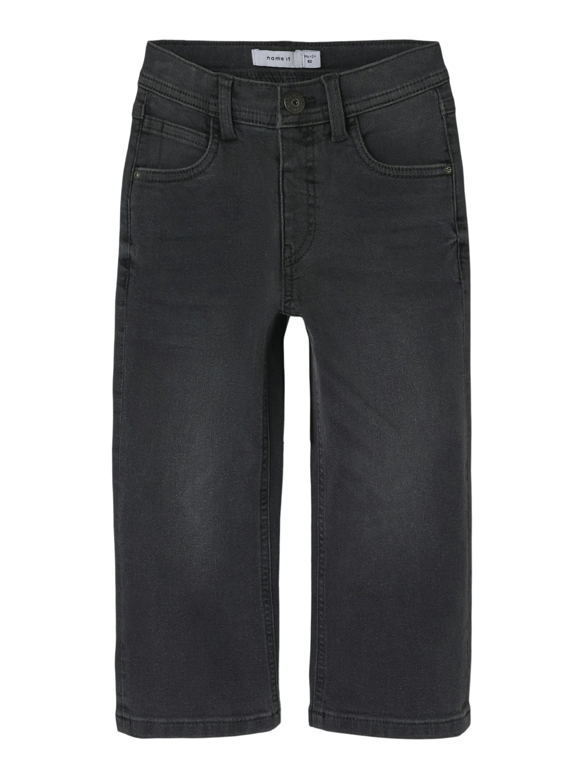 Name It Jeans i x-slim fit til dreng. De er i en lys denim med trykknaplukning og halv, falsk gylp.