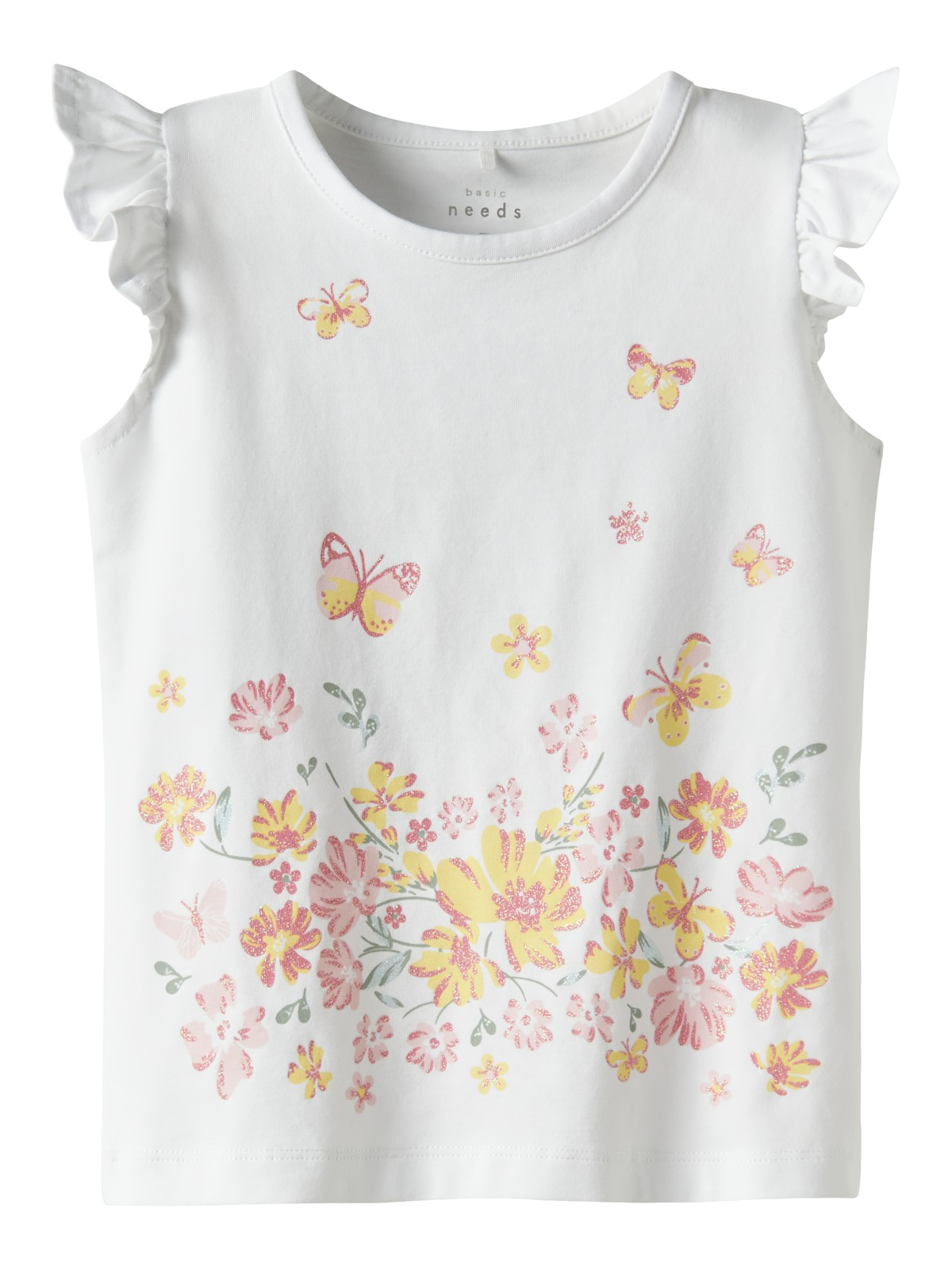 Super sød Hummel body til baby pige med flæser ved skulder. Den har korte ærmer og er i en skøn coral med hvid og lys rosa nuancer. Den har rund hals og praktiske trykknapper på venstre skulder og forneden.
