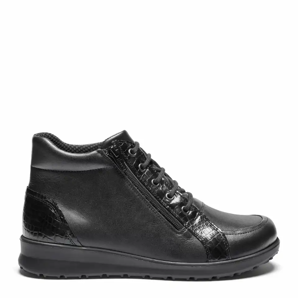Damestøvle med snøre og lynlås. Åndbart On-Steam® for. Ydersålen er lavet i TR, med lav hæl og let gængefunktion. Inde i støvlen har vi lagt en udtagelig 6 mm stødabsorberende Protektor® indlægssål.