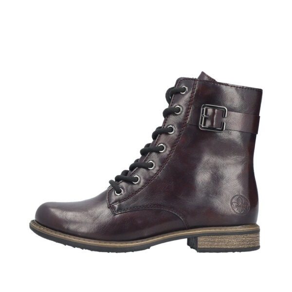 Håndlavet desert boot med snørebånd, udført i lakeret skind med rund tå. Farven er en varm, smuk kastanje-bordeaux, en signatur-nuance i denne efterårskollektion. Den er dekoreret med syninger rundt langs fronten og har en sål af rågummi.