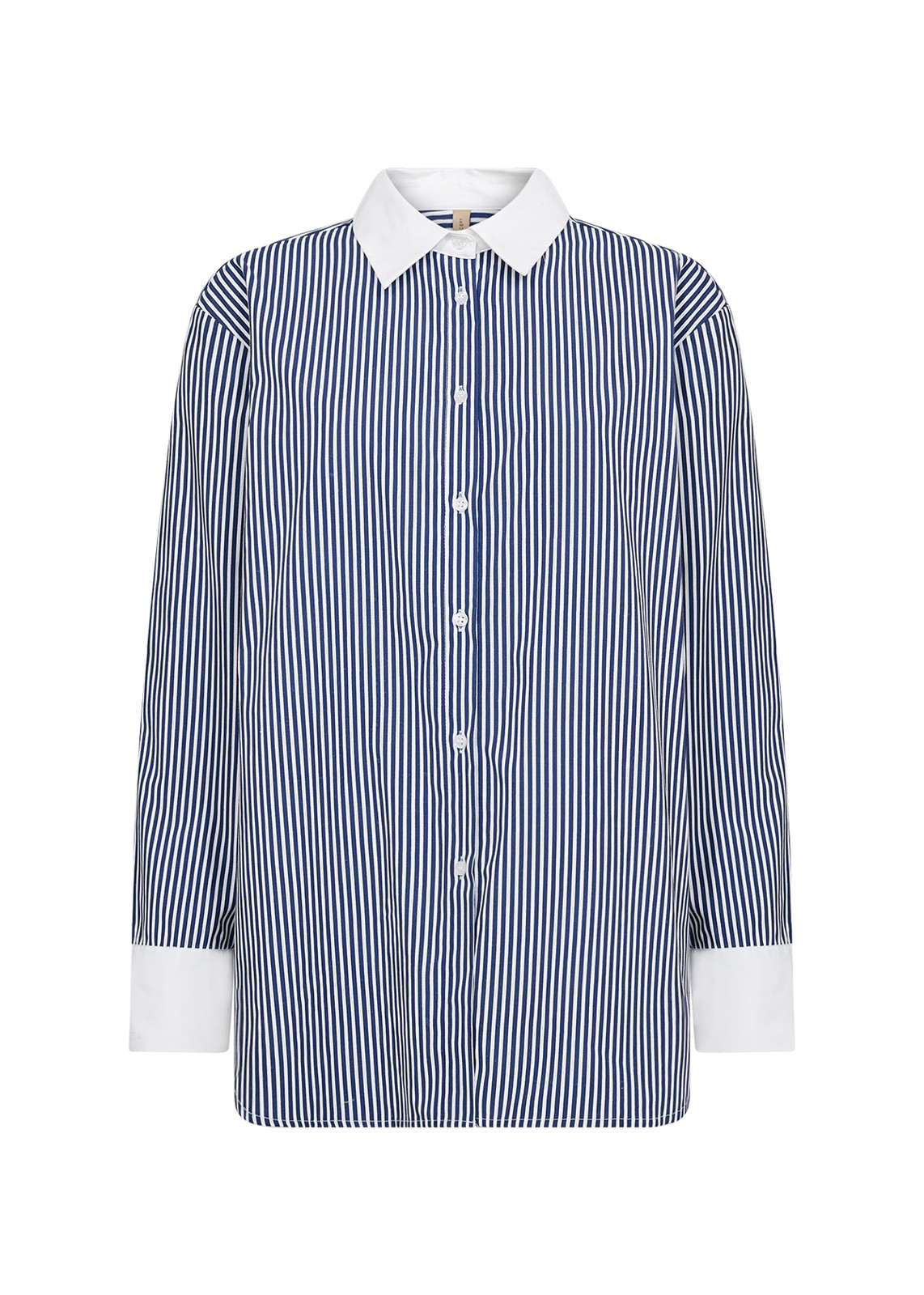 Description DA: SC-BELINDA 2 skjorte er fremstillet af 53% genbrugspolyester og 47% økologisk bomuld. Denne fine Soya Concept skjorte har en klassisk krave, knaplukning foran og lodrrette striber. Krave og manchet har kontrast farve for en ekstra detalje. Den har en rummelig pasform og en smule længde.