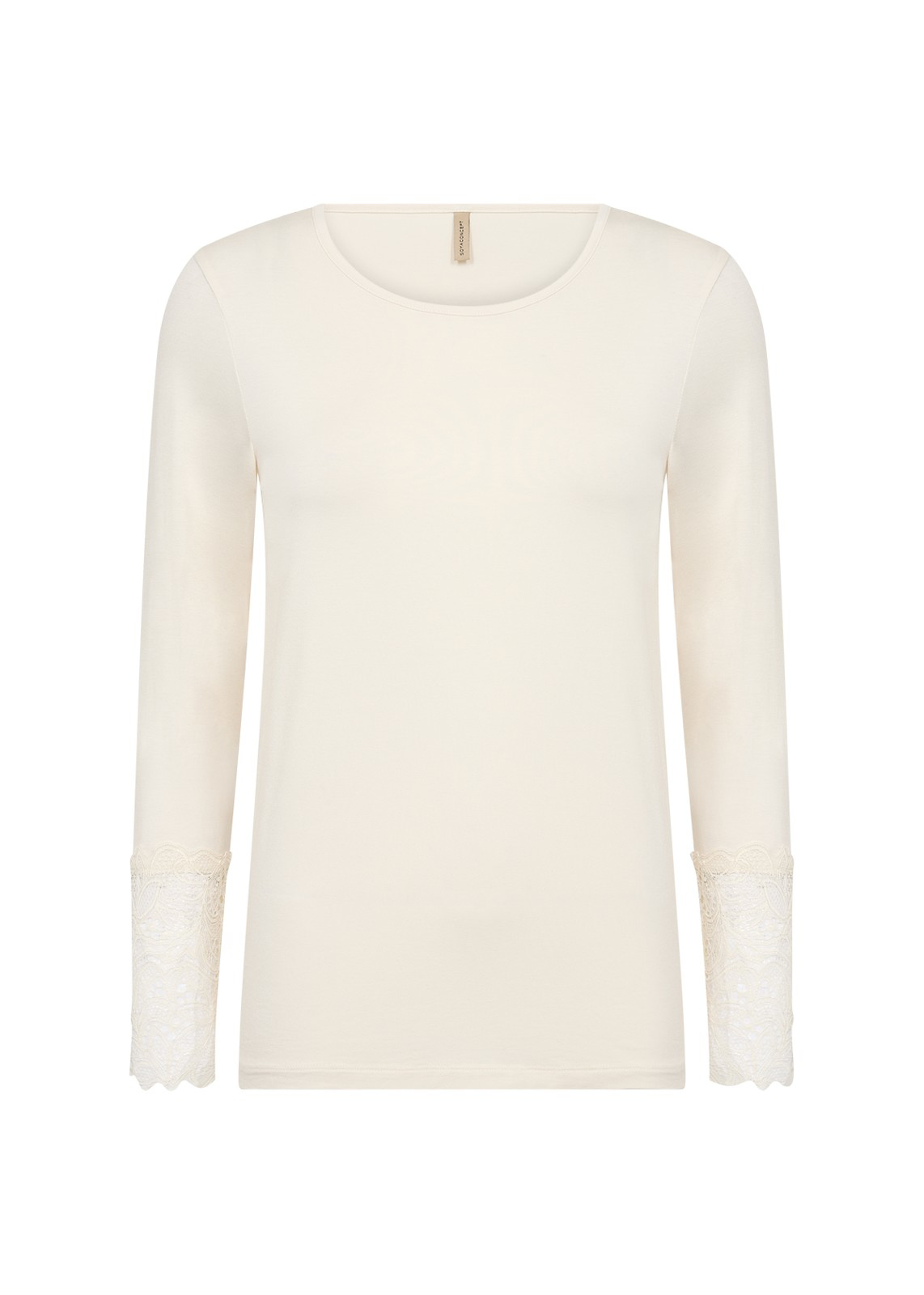 Super flot basic T-shirt fra Soya Concept med blondemanchetter. T-shirten har en rund udskæringæring, lange ærmer med blondemanchetter og en tætsiddende pasform. Style den under fx din kjole eller skjorte for et feminint look med blonder.