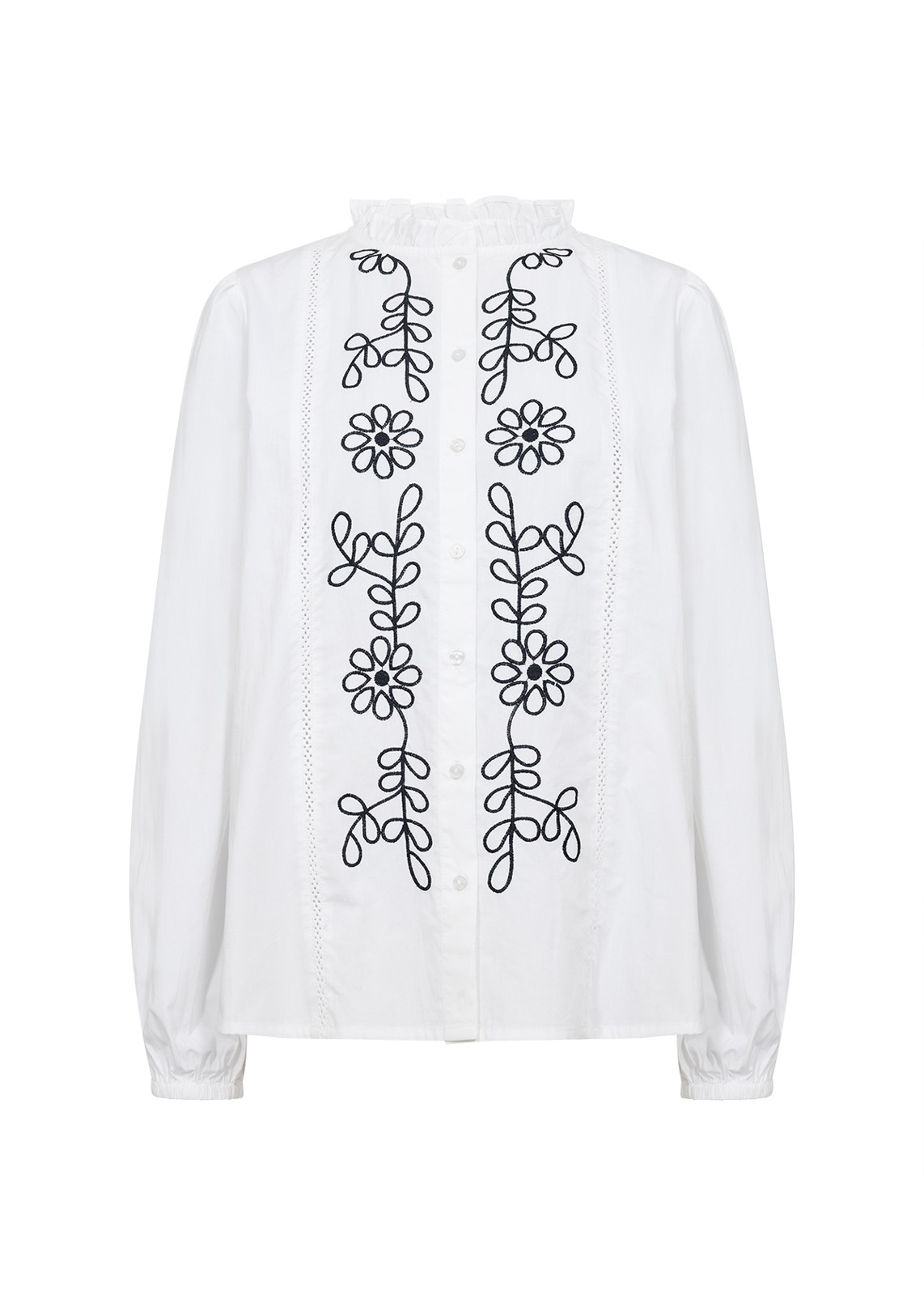Skøn og trendy Culture skjorte med farverige broderinger. Skjorten har en klassisk krave med flip og lange æmer med en bred manchet. På hver sin side af stolpelukning og ned langs ærmerne er der de smukkeste broderier i et flot farvemix.